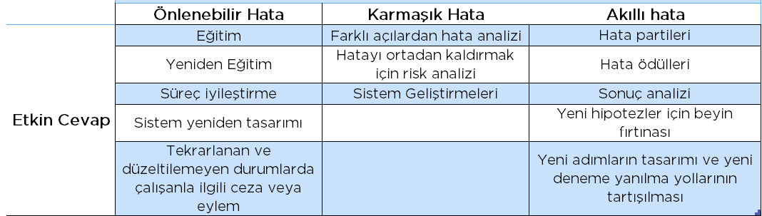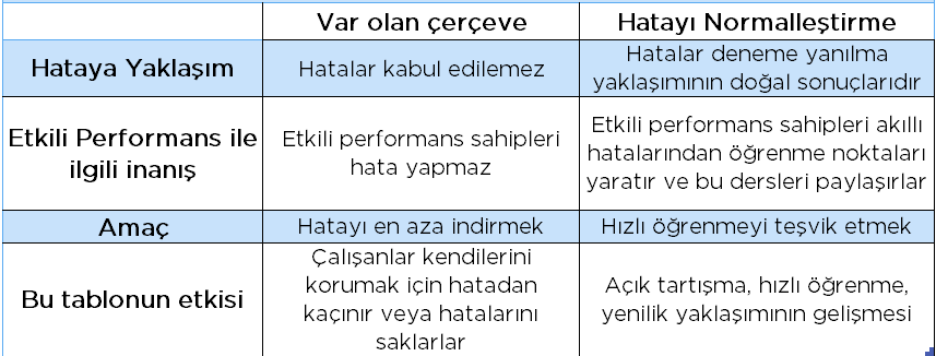 Hatalar aslında yenilikçi yaklaşımın bir yan etkisi olarak görülmeli, en etkili süreci ve stratejiyi bulmak için bir deneme sürecinin bir parçası gibi… Yapılan bir araştırmada üst düzey yöneticilerin yapılan hataların sadece %1-%4’ü arasındakilerin “birini suçlamak” için uygun olduğunu belirttikleri fakat buna karşılık yapılan hataların %80-%90’ında birilerinin suçlandığını söyledikleri ortaya çıkmış. Ekibinizde, şirketinizde “hata ile ilgili yaklaşımı” aşağıdaki tablodaki gibi değiştirmeye ne dersiniz?