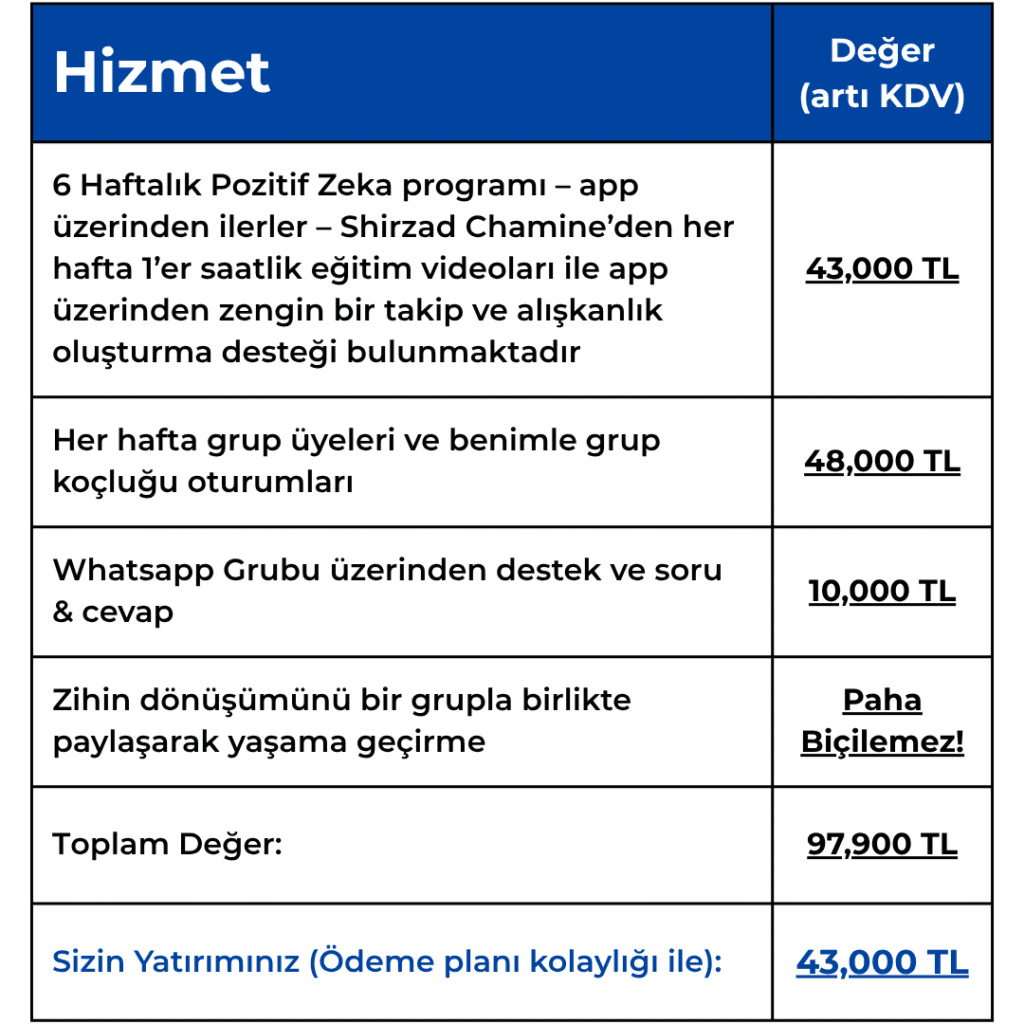 Pozitif Zeka mentörü olarak tüm dünyada geçerli bu programı sizlere avantajlı şekilde sunabiliyorum.