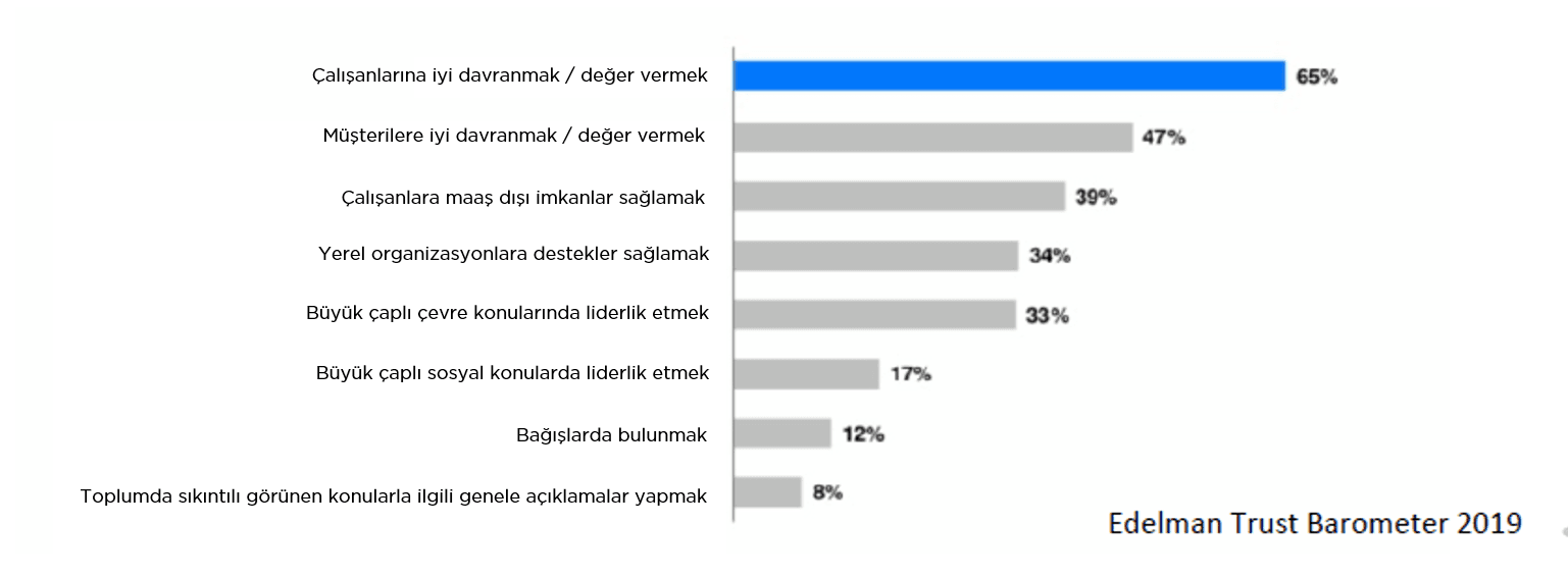 Bu Birleşik Krallık kaynaklı çalışmaya göre ankete yanıt verenlerin %65’i şirketlerinin en önemli yükümlülüğünün çalışanlarına olduğunu belirtmiş, bu müşterilerine olan yükümlülük desteğinin %18 üzerinde görünüyor. Çalışanlara maaş dışında imkanlar sağlamak seçeneğini de çalışana değer verme içinde değerlendirebiliriz, bu şekilde baktığımızda da şirketlerin başarıya ulaşması için çalışanların en önemli konumda olduklarını görüyoruz.
